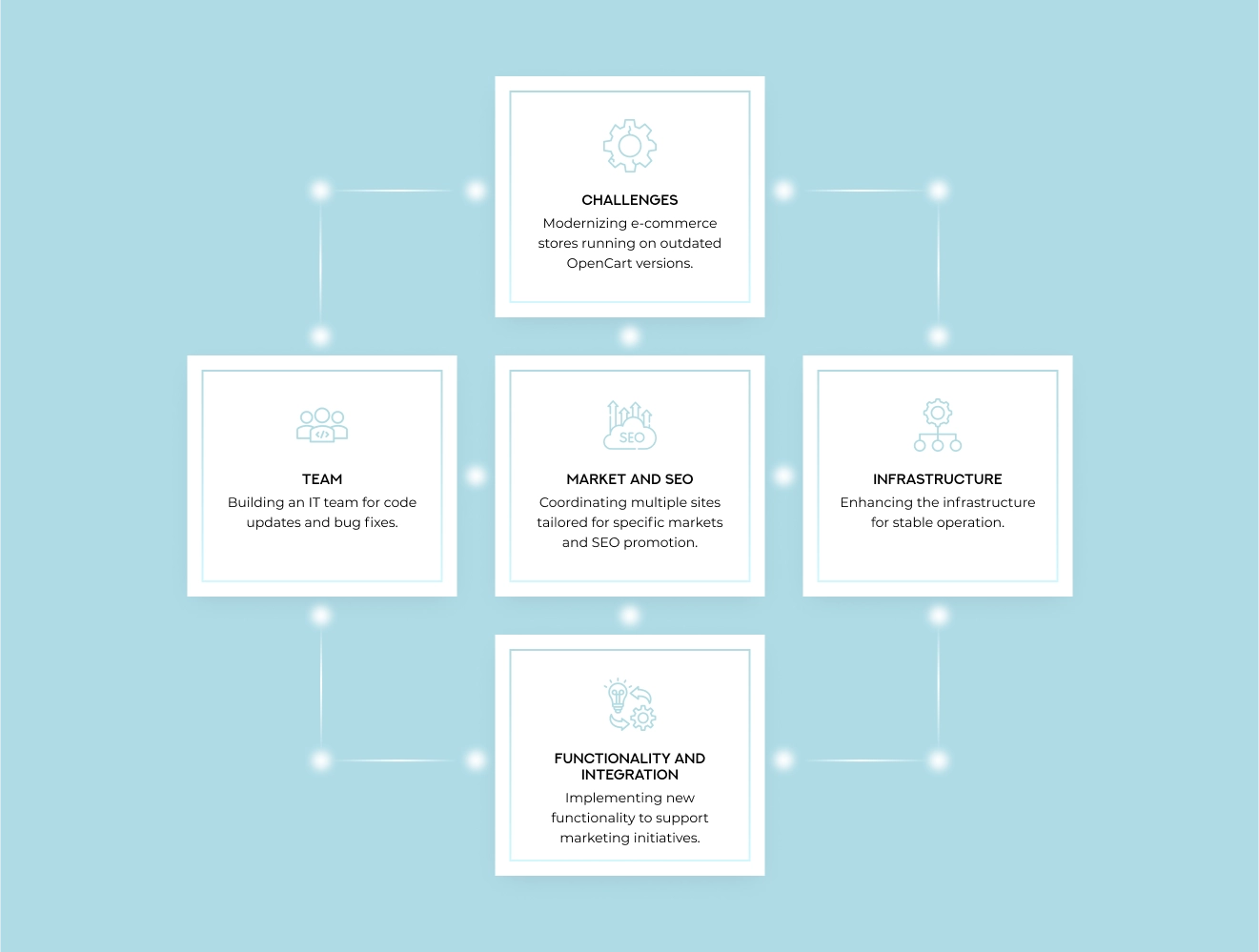 At the beginning of the project, we solved the main problems with updating outdated OpenCart-based online stores. Our team updated the code, fixed bugs, and improved the infrastructure to ensure smooth operation. Managing multiple sites for different markets added complexity, requiring constant coordination to maintain SEO and operations.