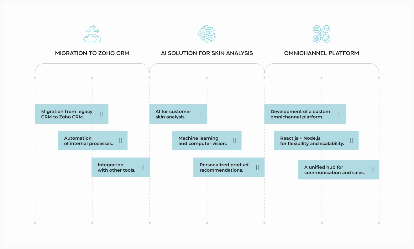 In the second phase, we upgraded the CRM system to Zoho CRM, carefully migrating data and customising it to meet specific business needs. This improved customer relationship management, automated internal processes, and ensured seamless integration with other tools.